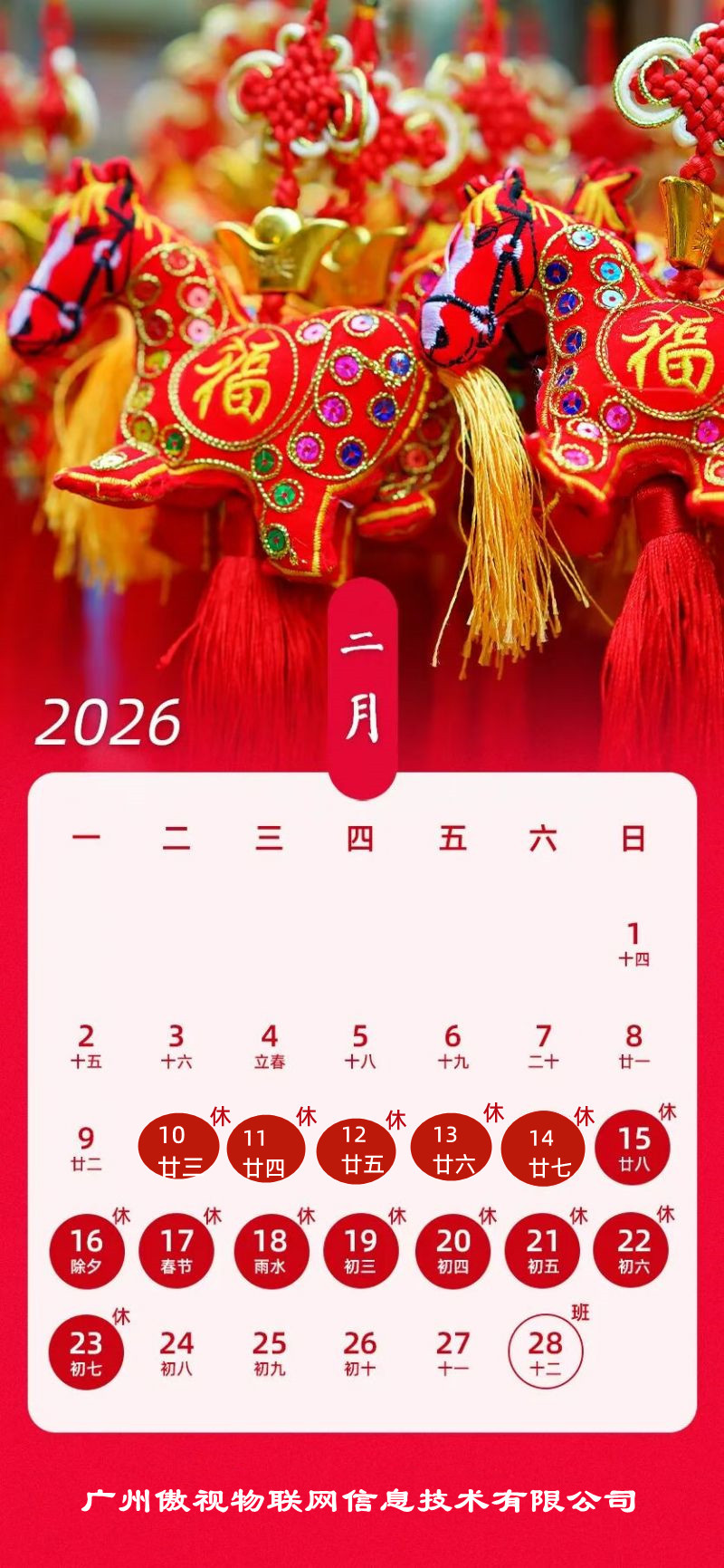 衷心感谢您一直以来对我们的信任与支持! 值此2026 年春节,根据《国务院办公厅公布2026年节假日安排通知》,为配合公司的订单业务情况,现就春节放假安排时间通知如下: