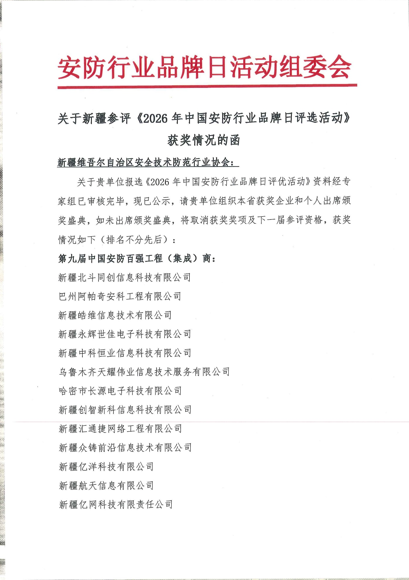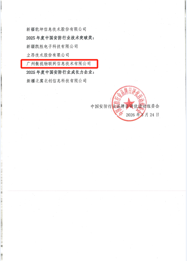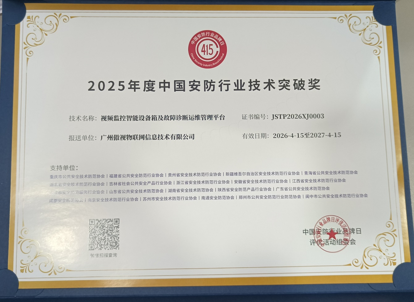 “2026中国安防行业品牌日”评优活动颁奖典礼于2026年4月16日在重庆市隆重举行,由新疆安全技术防范行业协会审核和推荐的我司《视频监控智能设备箱及故障诊断运维管理平台》项目技术,经中国安防行业品牌日评优活动组委会的专家评审通过,荣获“2025年度中国安防行业技术突破奖”。